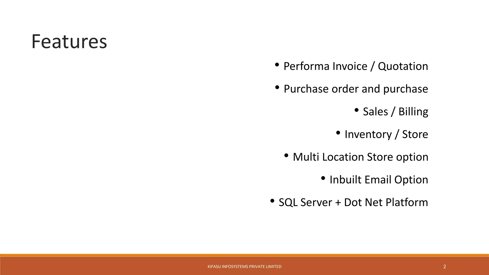This document describes the features and specifications of accounting software provided by Kifasu Infosystems Private Limited. The software allows users to perform accounting functions like invoices, purchase orders, sales, inventory, payments. It has features like multi-location stores, email integration, and reports. The document outlines the various modules for accounts, sales, purchases, payments, stock and generates different types of accounting reports.