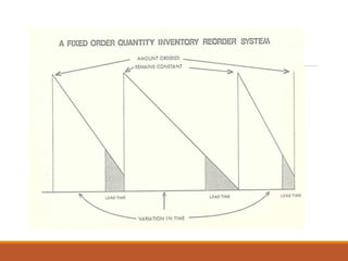 1) The document discusses various aspects of inventory control including types of inventory, reasons for carrying inventory, benefits and costs of inventory control, inventory models, parameters that influence inventory levels, safety stock, and replenishment systems.
