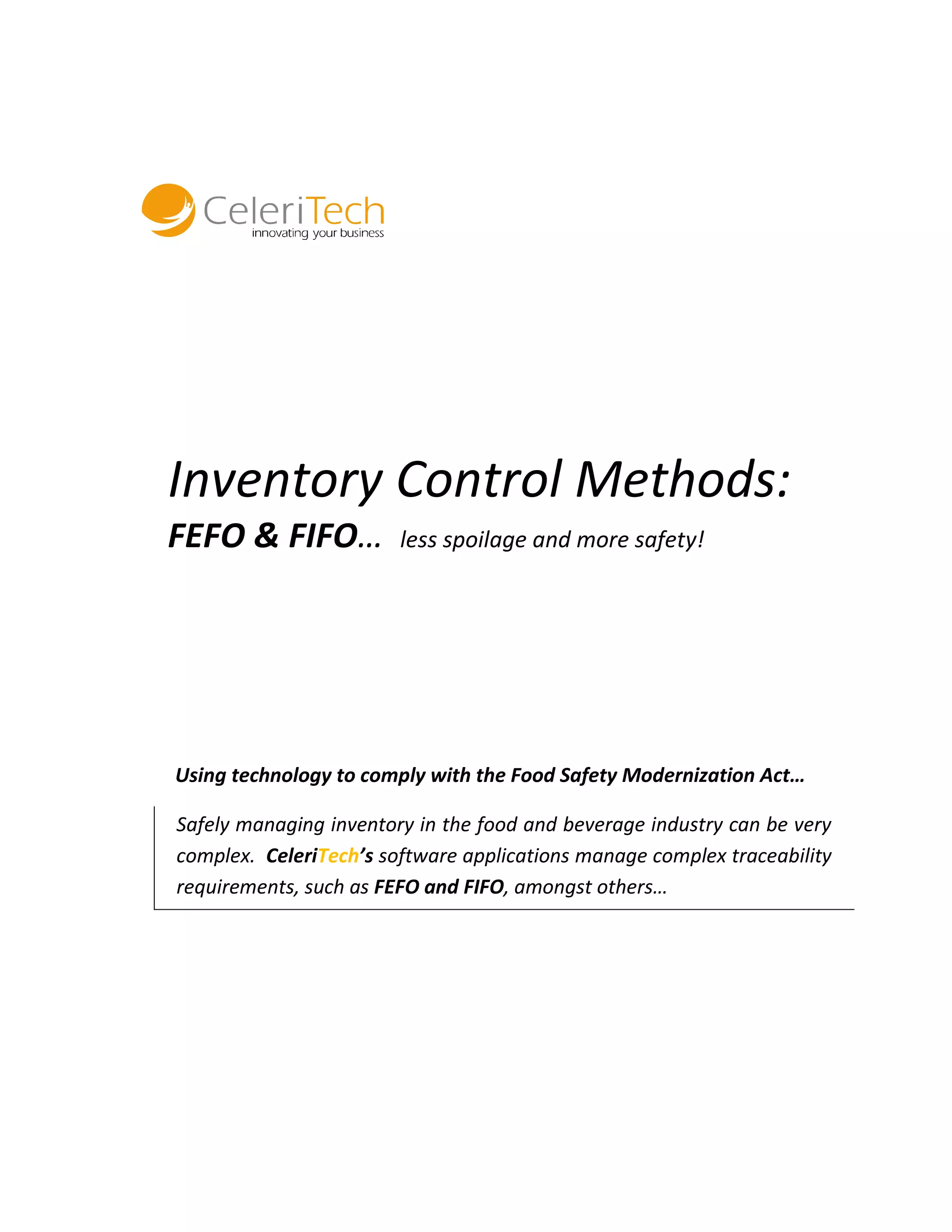 The document discusses inventory control methods for food and beverage companies, specifically FIFO (first in, first out) and FEFO (first expired, first out). It explains that FEFO prioritizes products with the shortest shelf life to be distributed first to reduce spoilage, while FIFO ensures the oldest products in inventory are shipped out first. The document also notes that software like SAP Business One can help companies comply with regulations through features like tracking expiration dates and automatically implementing FEFO and FIFO.