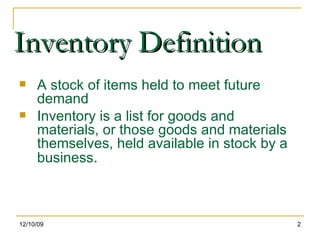 - There are different types of inventory including raw materials, work in progress, and finished goods. The objectives of inventory management are to maintain optimal inventory levels for smooth operations while minimizing costs.
