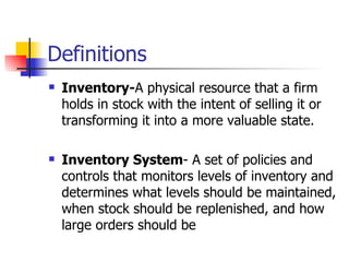 The document discusses inventory management and various inventory systems. It defines inventory and different inventory types like raw materials, work in process, and finished goods. It describes the costs of carrying inventory and different inventory measurement methods. It also summarizes economic order quantity models, reorder points, periodic review systems, ABC classification, and anticipatory versus response-based inventory control systems. The goal of inventory management is to balance inventory levels and costs with customer service levels.