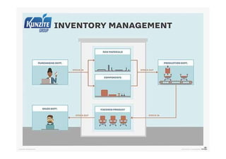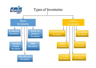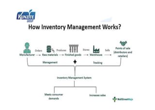 Inventory management refers to the process of ordering, storing, using, and selling a company's inventory, including raw materials, components, and finished products. It aims to have the right amount of inventory to meet customer needs without overinvesting, and involves demand planning, determining optimal inventory levels, inventory tracking and control, and periodic counting.