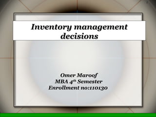 This document discusses inventory management decisions and concepts. It begins by defining inventory and inventory systems. It then discusses inventory costs, classifications, and purposes. The document covers independent and dependent demand. It also covers single-period and multi-period inventory models, including the basic fixed-order quantity model and economic order quantity (EOQ) formula. Examples are provided to demonstrate how to calculate the optimal order quantity and reorder point using the EOQ model.