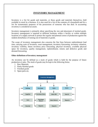 This document discusses inventory management. It defines inventory and explains that inventory management involves determining optimal stock levels while balancing carrying costs, replenishment lead times, and demand forecasting. The document then provides more details on types of inventory, reasons for keeping stock, variables that affect inventory problems, classifications of inventory models, and deterministic inventory models like the economic order quantity model.
