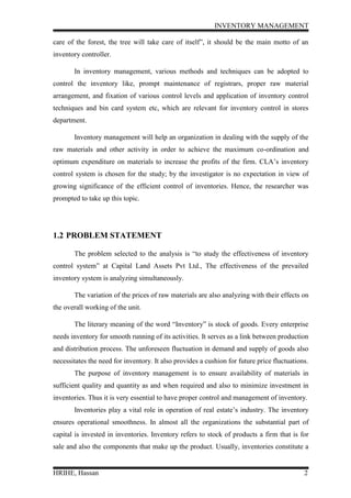 The document discusses inventory management and control techniques. It defines inventory as including raw materials, work-in-progress, and finished goods. It outlines the objectives of inventory management as ensuring availability of materials when needed while minimizing investment costs. The document also describes different types of inventories and factors that influence inventory levels. It discusses various inventory control techniques used by organizations.