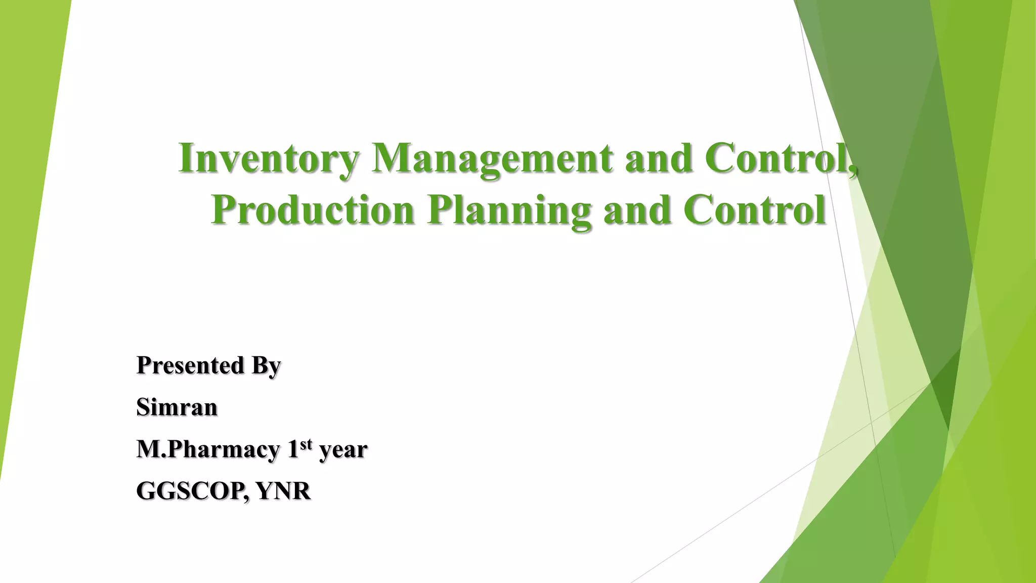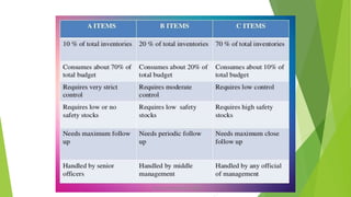 This document provides an overview of inventory management, production planning, and control. It discusses key objectives like minimizing costs and ensuring adequate supply. Inventory management techniques include ABC analysis, VED analysis, EOQ, lead time, and buffer stock. Production planning determines facility requirements and layout, while production control monitors plan execution and addresses deviations. The perpetual inventory system uses bin cards, store ledgers, and continuous stock taking to regularly check and prevent stockouts.
