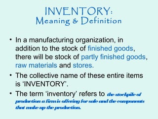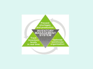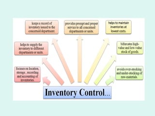 1. The document discusses inventory management techniques like ABC analysis and economic order quantity model. ABC analysis classifies inventory items into A, B and C categories based on their value and economic order quantity determines the optimal order quantity that minimizes total inventory costs.