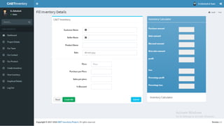 The document outlines a proposed sales and inventory management system that aims to improve the efficiency of managing stock, sales, purchases, and customer interactions. It highlights existing problems with traditional systems, such as slow processing and lack of data security, and offers a modular software solution with features like inventory management, report generation, and graphical progress tracking. The system is designed to be user-friendly, secure, and adaptable, utilizing modern web technologies for frontend and backend development.