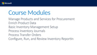 This document provides a comprehensive guide on configuring and managing products and inventory in Microsoft Dynamics 365 for Finance and Operations, covering aspects such as item and dimension groups, inventory management, and reporting. Key functionalities include setup for inventory journals, management of transfer orders, and utilization of the ABC classification system to prioritize inventory control. Additionally, it outlines inventory tracking, product attributes, and the creation of warehouse structures to facilitate smooth operations and reporting.