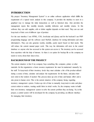 This document details an undergraduate internship project focused on developing an online Inventory Management System to streamline stock analysis and management for Digital Dream, a software services company in Bangladesh. The system aims to reduce manual paperwork, improve data accuracy, and enable efficient inventory tracking and reporting through a user-friendly interface built with technologies like PHP and MySQL. The project addresses current inefficiencies in manual inventory management processes by providing functionalities for adding, editing, and tracking inventory in real-time from anywhere with internet access.