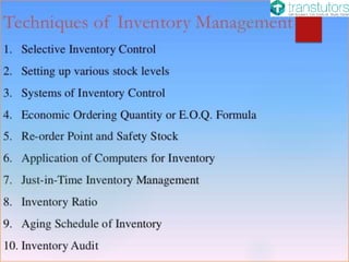 The document outlines the material flow cycle and introduces the Economic Order Quantity (EOQ) model for inventory management. It defines key variables such as annual demand, setup cost, and holding cost and lists important assumptions for the basic EOQ model. Additionally, it offers a calculation example to determine the optimal order quantity and discusses holding, ordering, and setup costs.