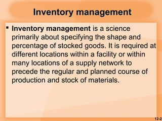 Inventory management involves determining the appropriate level and types of stocked goods. There are two types of demand: independent demand which is uncertain, and dependent demand which is certain. Effective inventory management requires tracking inventory levels, forecasting demand, and understanding costs like holding, ordering, and shortage costs. The economic order quantity (EOQ) model can be used to determine the optimal order quantity that minimizes total inventory costs. The reorder point is the level at which an item should be reordered, and safety stock is extra inventory held to protect against uncertain demand or lead times.