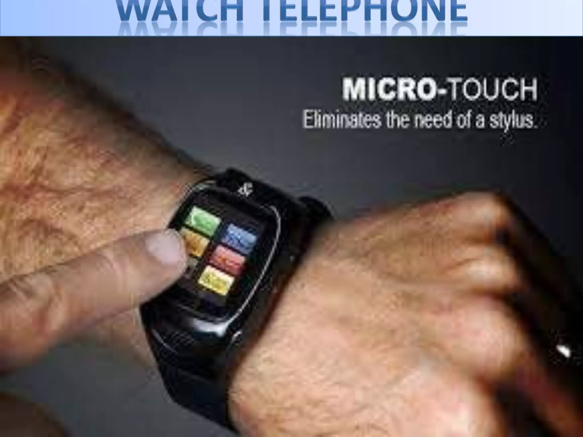 This document discusses watch phones, which are small devices that work as phones but are worn as watches. Watch phones contain a circuit board, microchips, and a plastic case and are manufactured in factories. They allow users to make calls by using a watch.