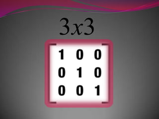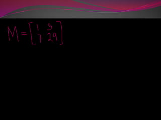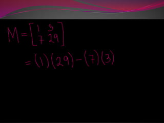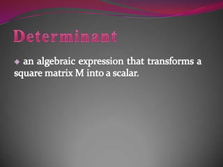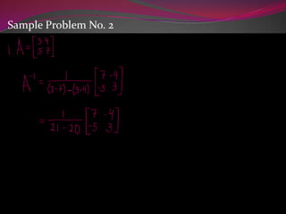 This document discusses inverse matrices. An inverse matrix A-1 undoes the transformation of the original matrix A such that multiplying A by A-1 or A-1 by A results in the identity matrix. The identity matrix is a square matrix with 1s on the main diagonal and 0s elsewhere. It leaves a matrix unchanged when multiplied. The determinant of a square matrix transforms it into a scalar value and is used to calculate the inverse. Sample problems demonstrate calculating the inverse of a 2x2 matrix.