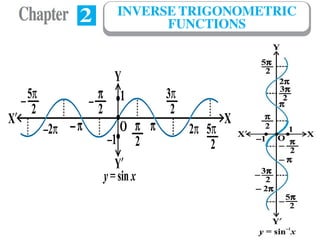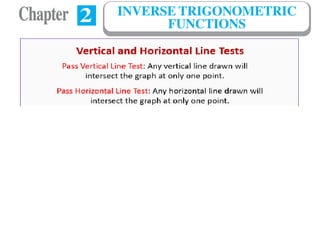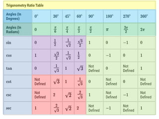 The document outlines the domains and ranges for various trigonometric functions, including sine, cosine, tangent, secant, cosecant, and cotangent, along with their inverse functions. It highlights which functions are one-to-one and not one-to-one, specifying the restrictions for each. Additionally, it provides mathematical representations for these functions and their inverses.