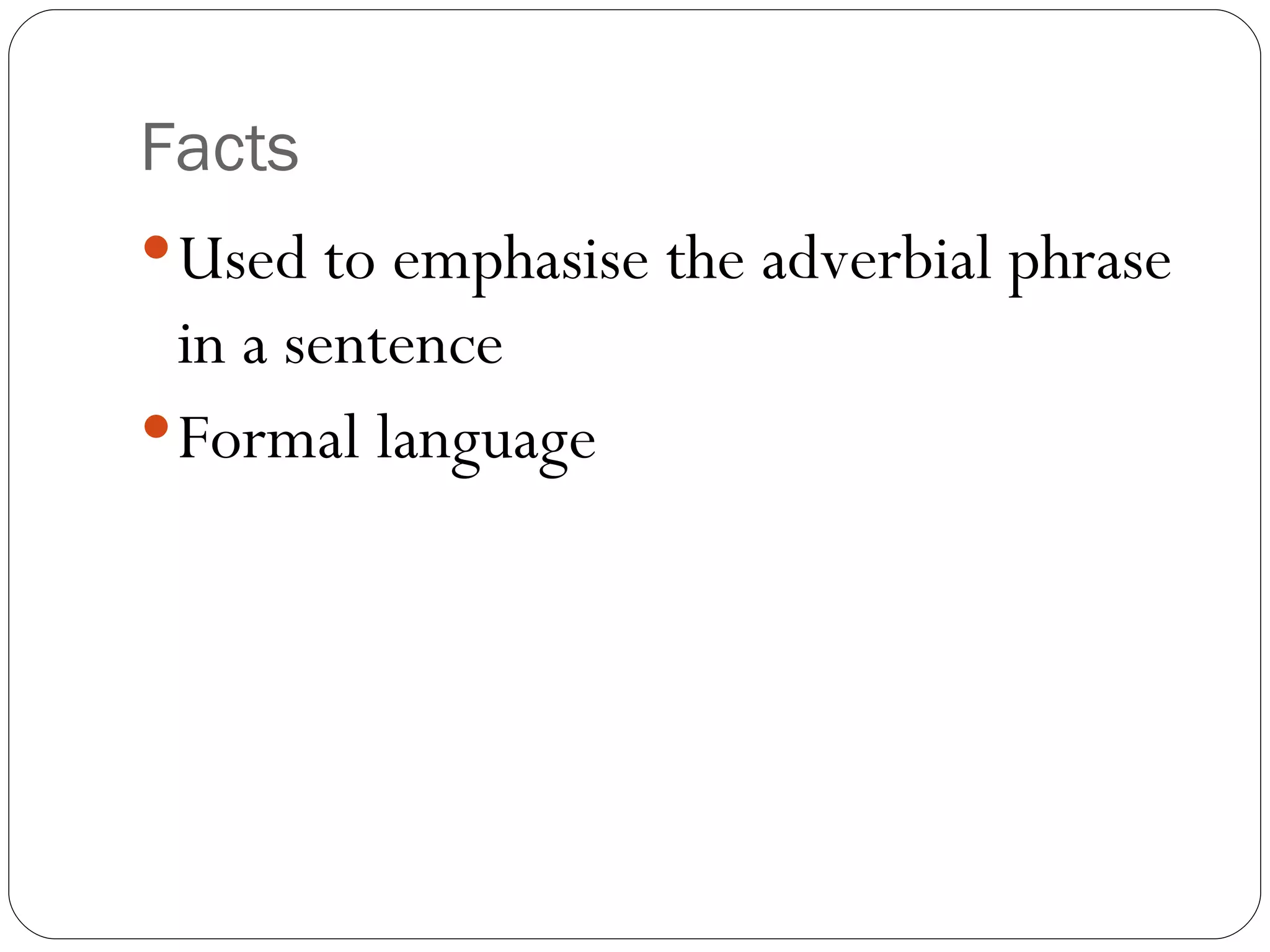 The document discusses different types of sentence inversions used to emphasize adverbial phrases. Type 1 inversions use an adverbial expression followed by an auxiliary verb and then the subject and main verb. Examples are given such as "Not only does he play football, but he also plays tennis." Type 2 inversions use an adverbial expression of place or movement followed by the main verb and then the subject. Examples include "Outside the house was a sports car" and "There goes the bus." The document provides information on emphasizing adverbial phrases through different inversion structures in English sentences.
