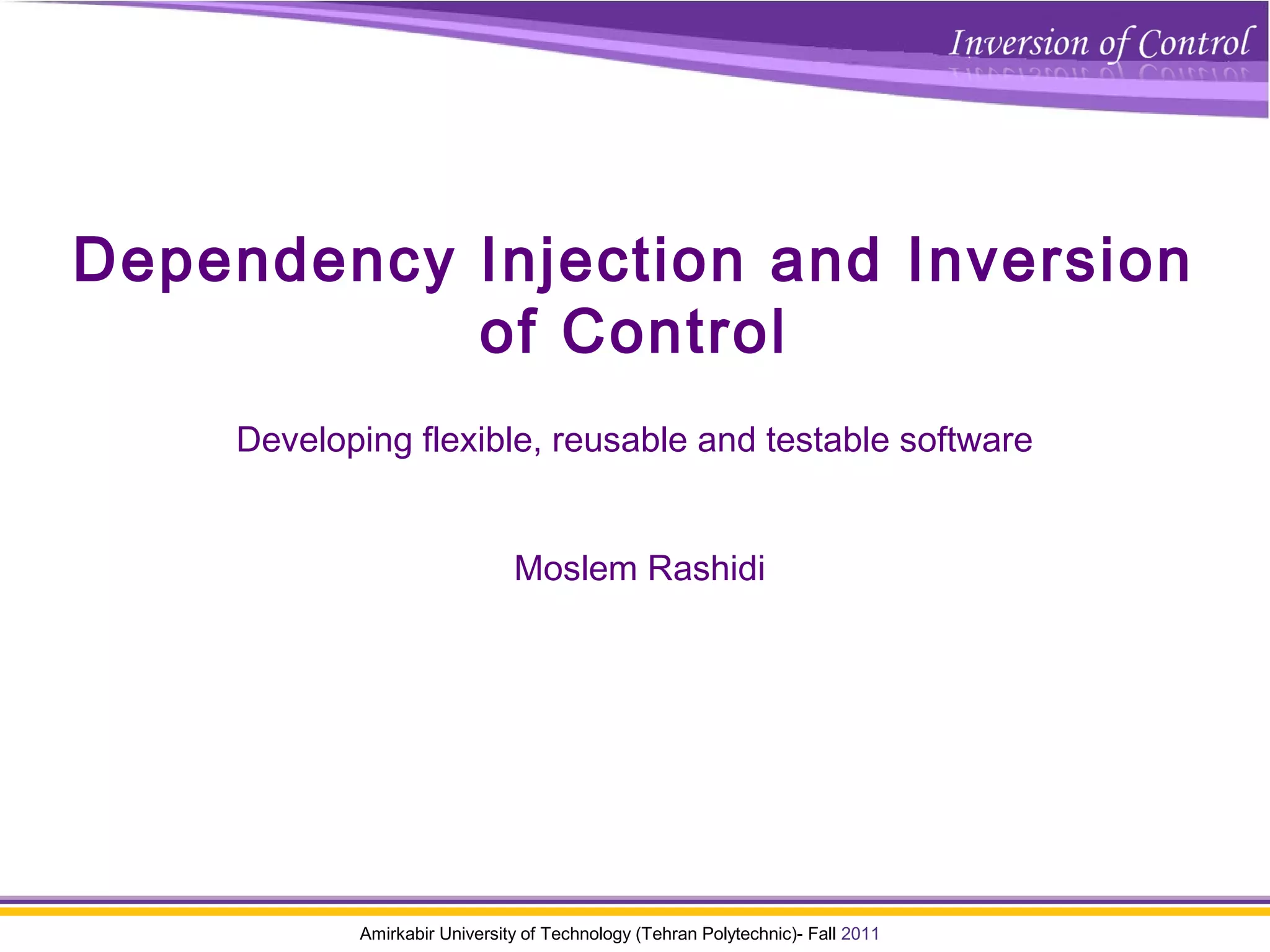 The document discusses dependency injection and inversion of control design patterns. It describes how loosely coupled systems can be achieved through constructor injection using an IoC container. The container handles resolving dependencies and managing object lifecycles, improving extensibility, testability, and reusability of code. Examples show how a trade monitor class is decoupled from its data access dependencies using interfaces, factories, and finally a Windsor IoC container for full dependency injection and management.
