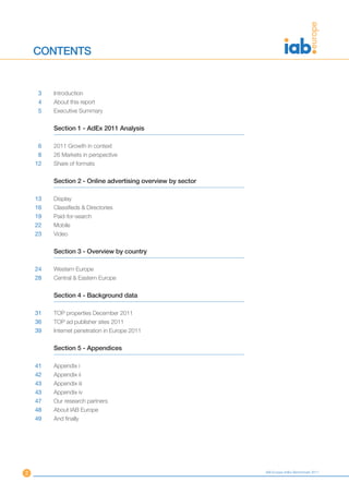 The document provides an analysis of online advertising expenditure (AdEx) in Europe in 2011. Some of the key findings include: