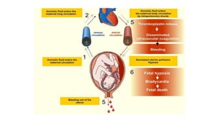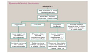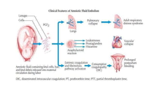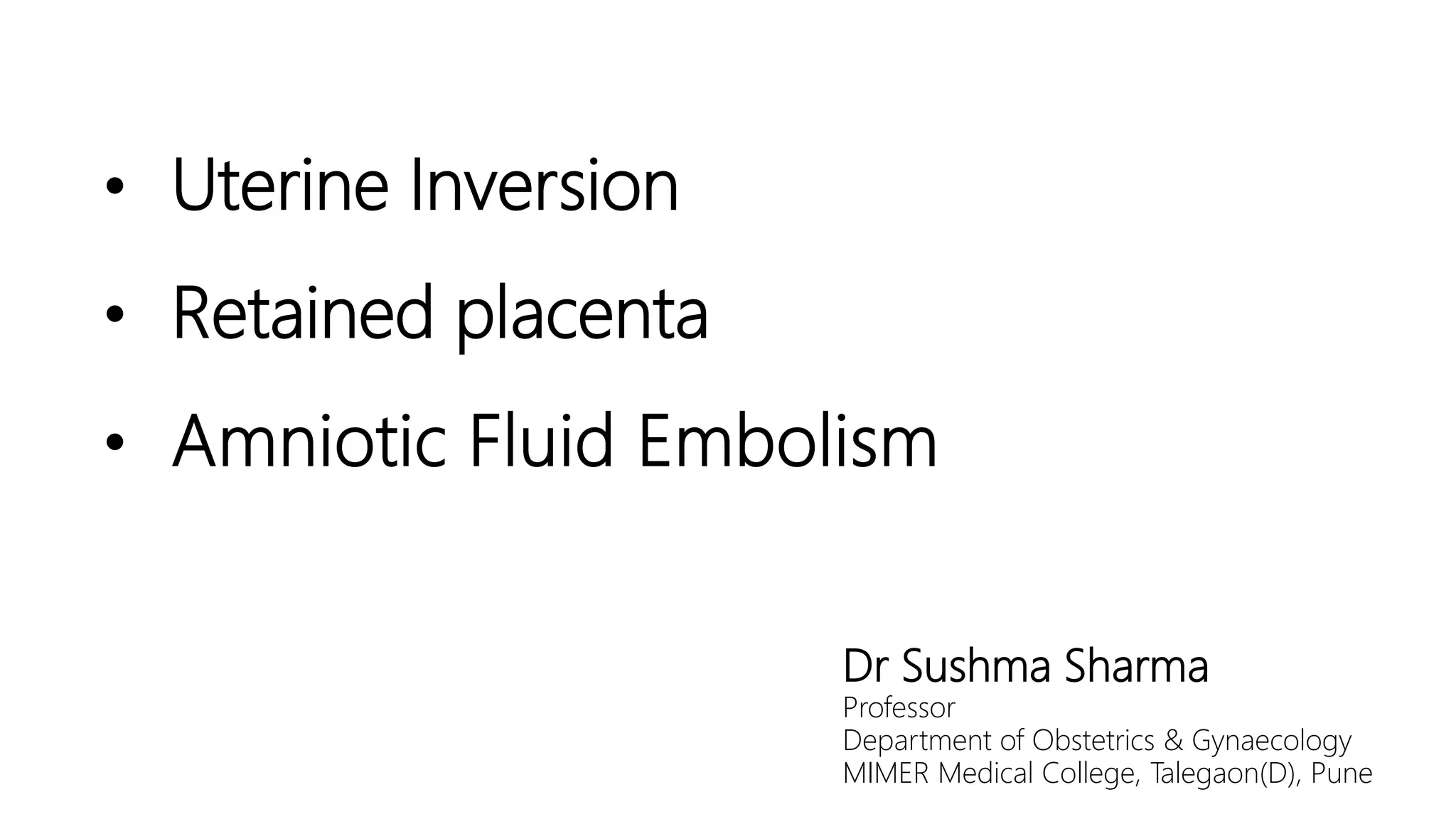 Uterine inversion and retained placenta are obstetric emergencies that require prompt recognition and management to prevent life-threatening complications like hemorrhage and shock. Uterine inversion occurs when the uterus turns inside out, and can be classified based on the extent of inversion and time since delivery. Retained placenta is defined as failure to deliver the placenta within 30 minutes of childbirth. Both conditions require urgent evaluation and treatment to replace the inverted uterus or manually remove the retained placenta while resuscitating the patient.
