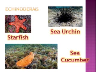 - Echinoderms (sea stars, sea urchins) have spiny skin, radial symmetry, and use tube feet and water vascular systems.