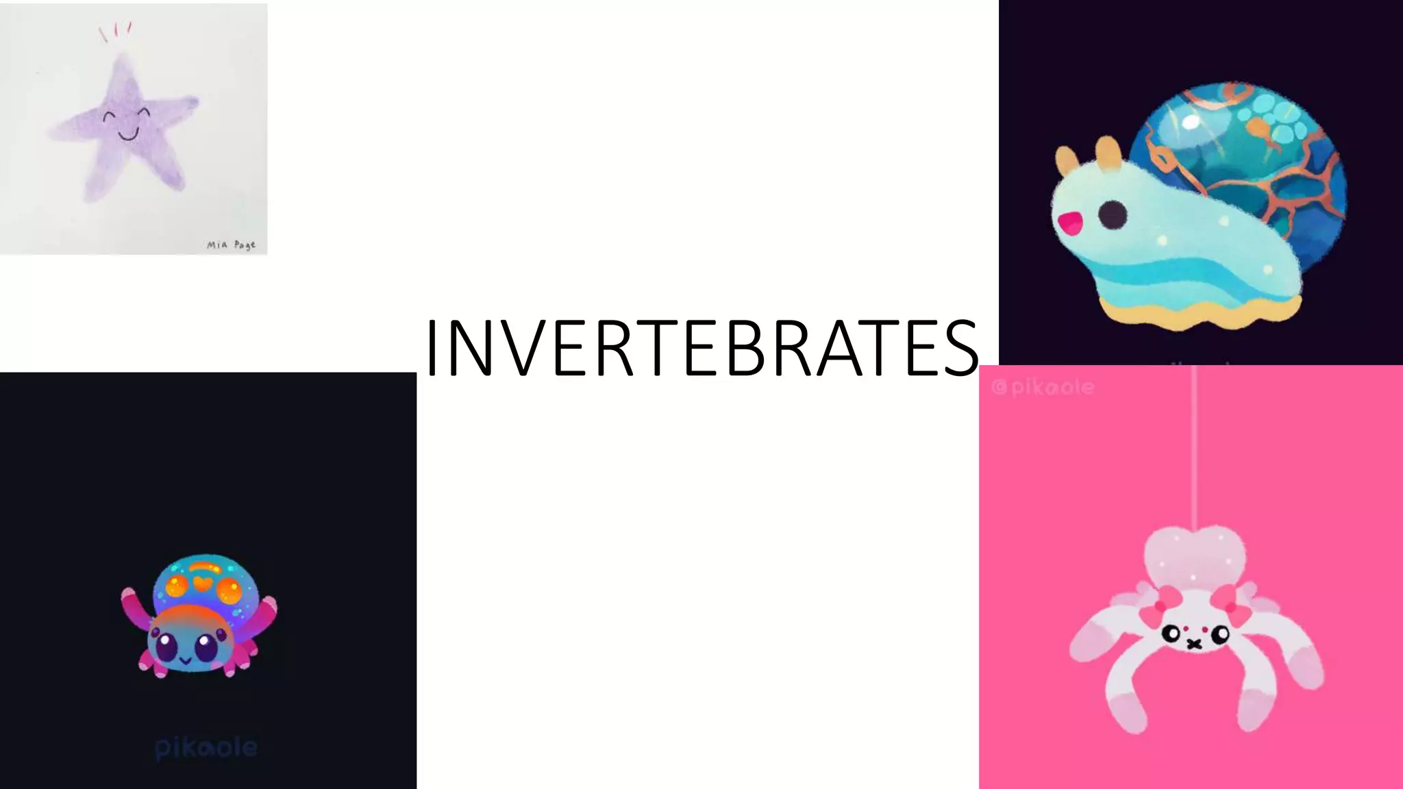 Invertebrates are animals without backbones or inner skeletons. They display a wide range of characteristics and live in various habitats around the world. The document categorizes invertebrates into six main groups - sponges, cnidarians, echinoderms, mollusks, worms, and arthropods. Each group contains different phyla of invertebrates that share similar anatomical features and life cycles.