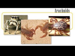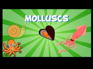 The document discusses the major groups of invertebrate animals. It describes that invertebrates do not have backbones and includes the largest phyla: arthropods, mollusks, worms, echinoderms, poriferans, cnidarians, and cephalopods. Each phylum is then further defined by key characteristics such as their body structure, habitat, diet, and examples of common types within that group.