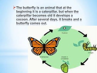 This document discusses invertebrate and vertebrate animals. It describes the main characteristics of invertebrates as lacking a spinal column or internal skeleton, and having bodies covered by shells, exoskeletons, or soft skin. The main groups of invertebrates are listed as jellyfish, sponges, annelids, arthropods, echinoderms, and mollusks. Butterflies are highlighted as invertebrate insects belonging to the arthropod group. In contrast, the main characteristic of vertebrates is having a spinal column or internal skeleton. Dogs are given as an example vertebrate, describing them as placental mammals with four legs that are not aquatic animals