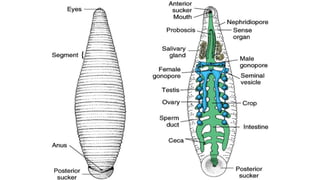 2) Polychaeta are mostly marine worms with parapodia and setae. They include sand worms, blood worms, and tube-dwelling filter feeders.