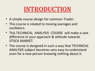 The document outlines a technical analysis course designed for traders and investors focusing on moving averages and oscillators, making the subject accessible even for beginners. It covers various trading indicators, concepts such as support and resistance, and different types of charts like bar, candlestick, and line charts. Additionally, the course emphasizes understanding moving averages and the MACD indicator for effective trading strategies.