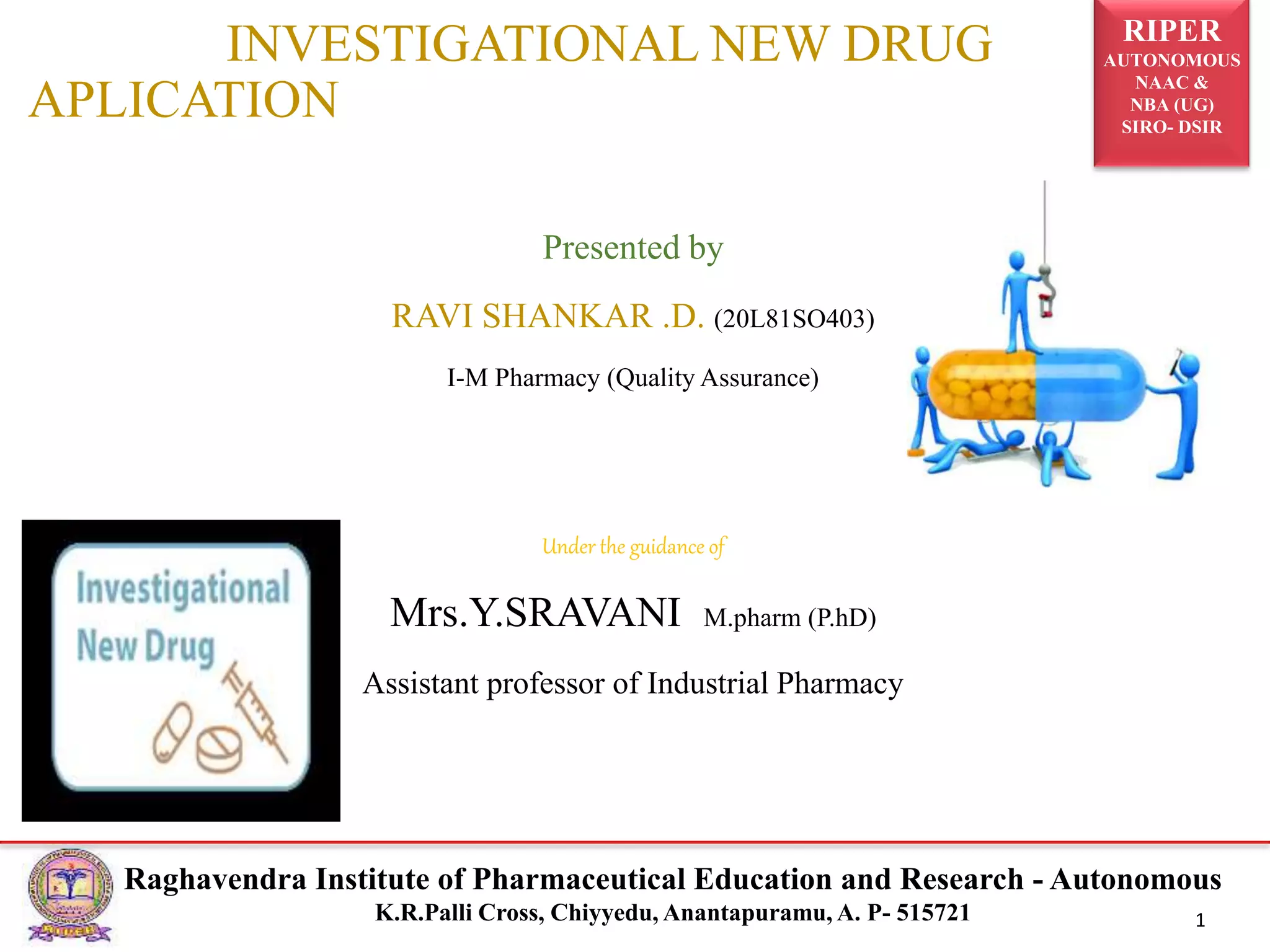 The document outlines the process and requirements for submitting an Investigational New Drug (IND) application to the FDA, which is necessary to initiate clinical studies for new drug products. It details the types and classifications of INDs, the components required in the submission, and the FDA review team involved in the assessment. Key sections of an IND include animal studies, manufacturing and clinical protocols, as well as pharmacology and toxicology information.