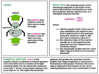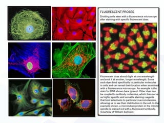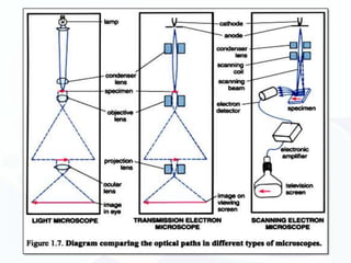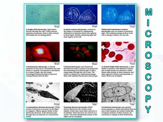 The document discusses various microscopy techniques used to study cells and their parts at the microscopic level. It describes light microscopes like compound, dissecting, and fluorescence microscopes. It also discusses electron microscopes like scanning and transmission electron microscopes. It explains techniques like cell fractionation, cell and tissue culture, laser capture microdissection, and microscopy that allow isolation and study of individual cells and organelles.