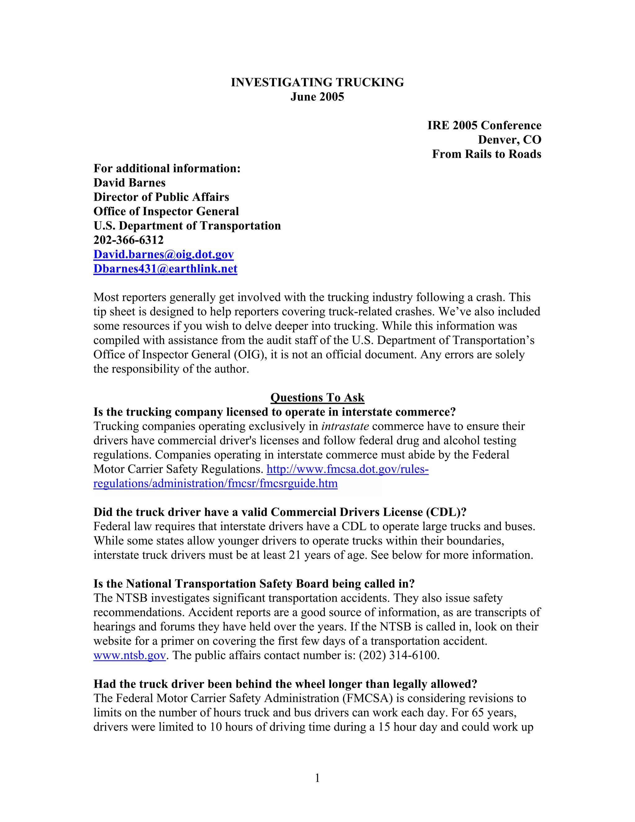 The document provides resources for reporters investigating trucking incidents, including truck crashes. It includes questions to ask during investigations, such as whether the trucking company and drivers were properly licensed. It also provides tips and potential follow-up story ideas, such as checking the accuracy of crash data reported by states and compliance with federal commercial driver licensing requirements. Contact information is provided for organizations related to trucking oversight and safety.