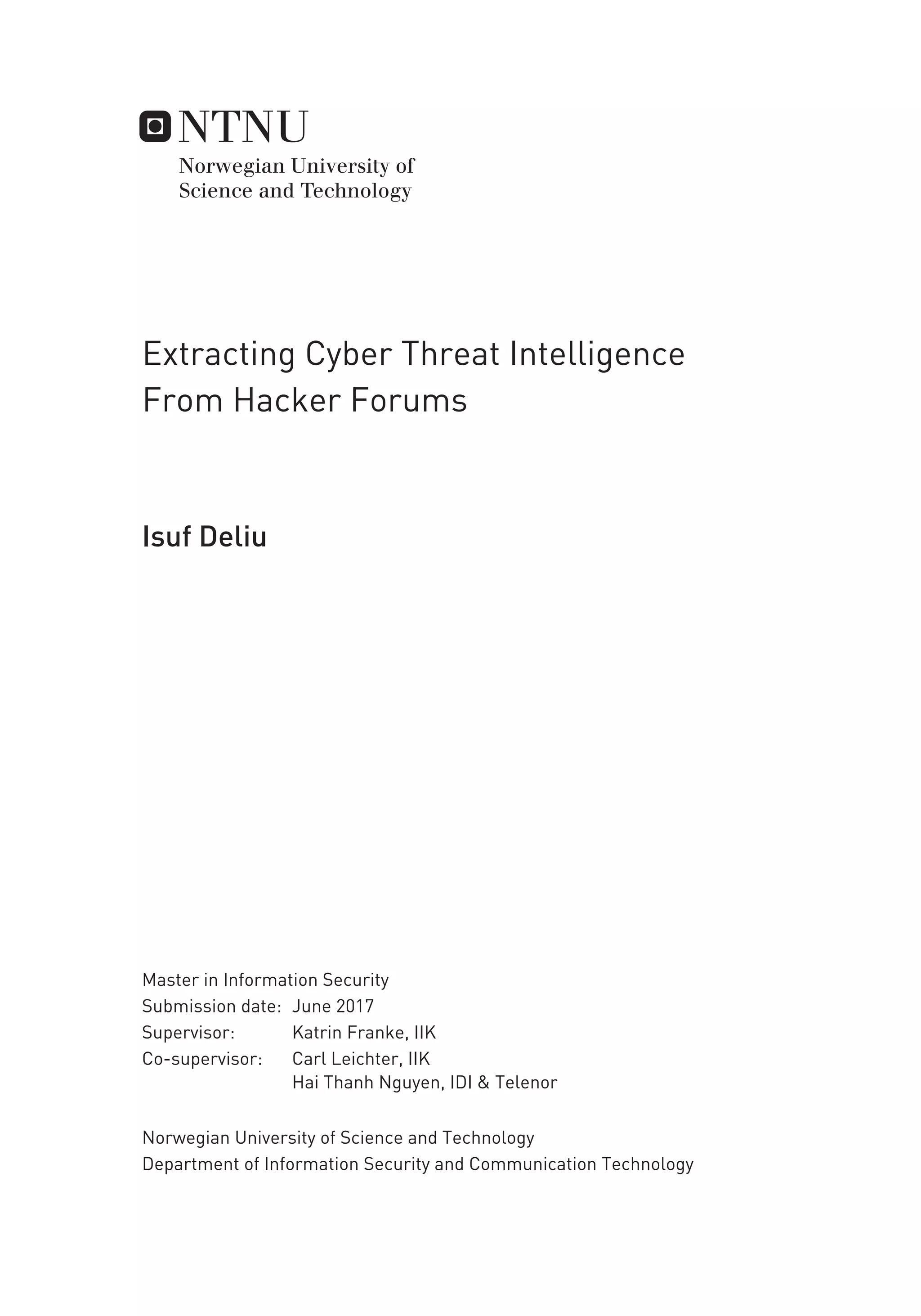 This thesis examines using machine learning methods to extract cyber threat intelligence from hacker forums. It proposes a two-phase process using supervised and unsupervised learning. In phase one, classifiers like support vector machines are used to classify forum posts as relevant or not to security. Phase two applies topic modeling to identified relevant posts to discover discussion themes. Experiments on a real hacker forum show these methods effectively identify security-related information including zero-days, credentials, and malware. The study demonstrates hacker forums can provide useful threat intelligence and machine learning helps analyze large amounts of forum data.