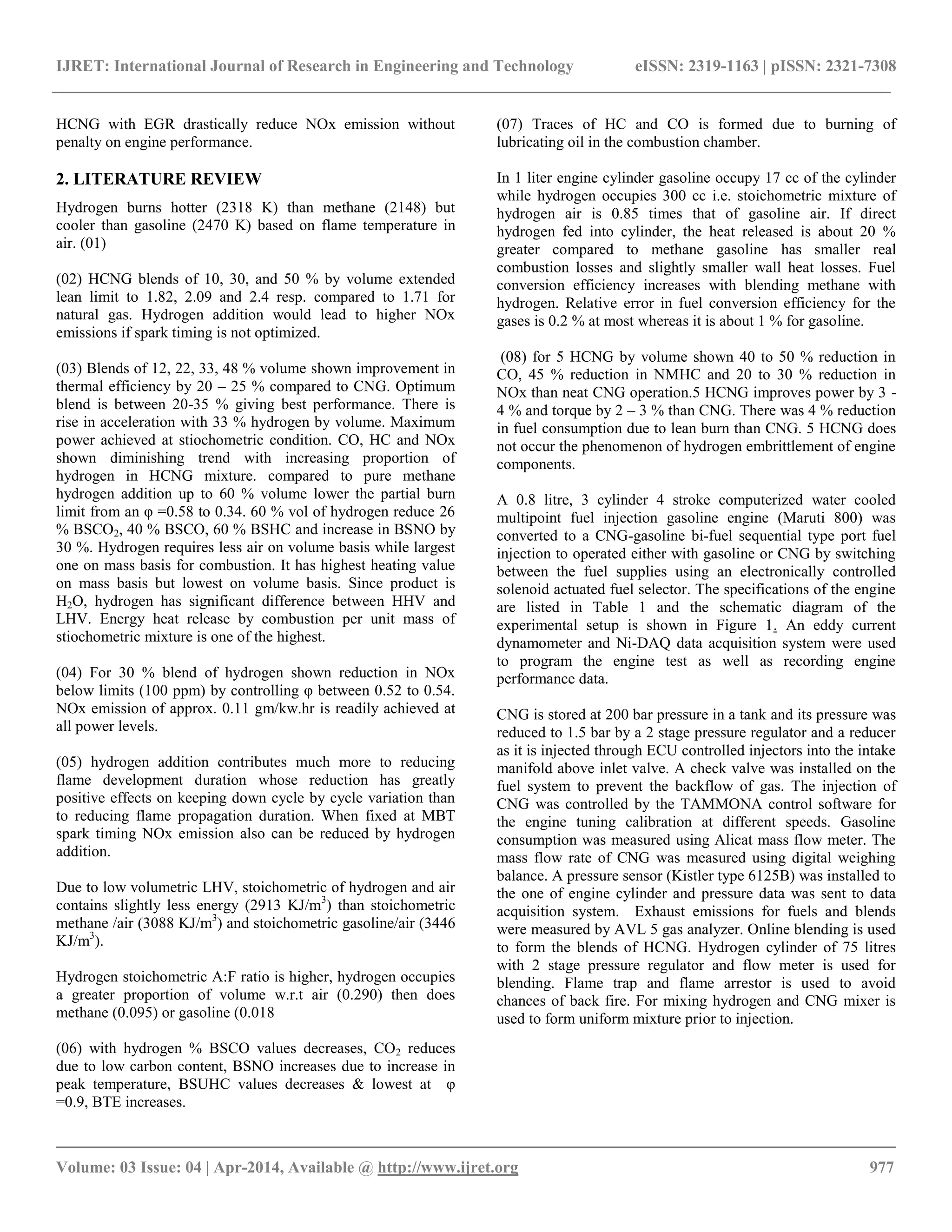 This study explores the effects of blending hydrogen with compressed natural gas (CNG) on the performance and emissions of a multi-cylinder S.I. engine. Results show that adding hydrogen (up to 13 wt%) leads to significant reductions in CO2 and NOx emissions, alongside improvements in brake thermal efficiency, while a slight power drop is observed due to reduced energy content. The optimal hydrogen blend was found to significantly reduce carbon-based emissions without compromising power output compared to CNG alone.