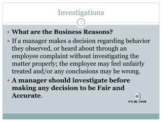 This document outlines the responsibilities of managers regarding workplace investigations and their duty to act on inappropriate behavior, emphasizing the importance of fairness and consistency in decision-making. It details procedures for conducting investigations, the role of HR, documentation requirements, and the implications of retaliation against employees who raise complaints. Additionally, it provides guidance on handling various situations, including employee protests and cooperative dynamics during investigations.