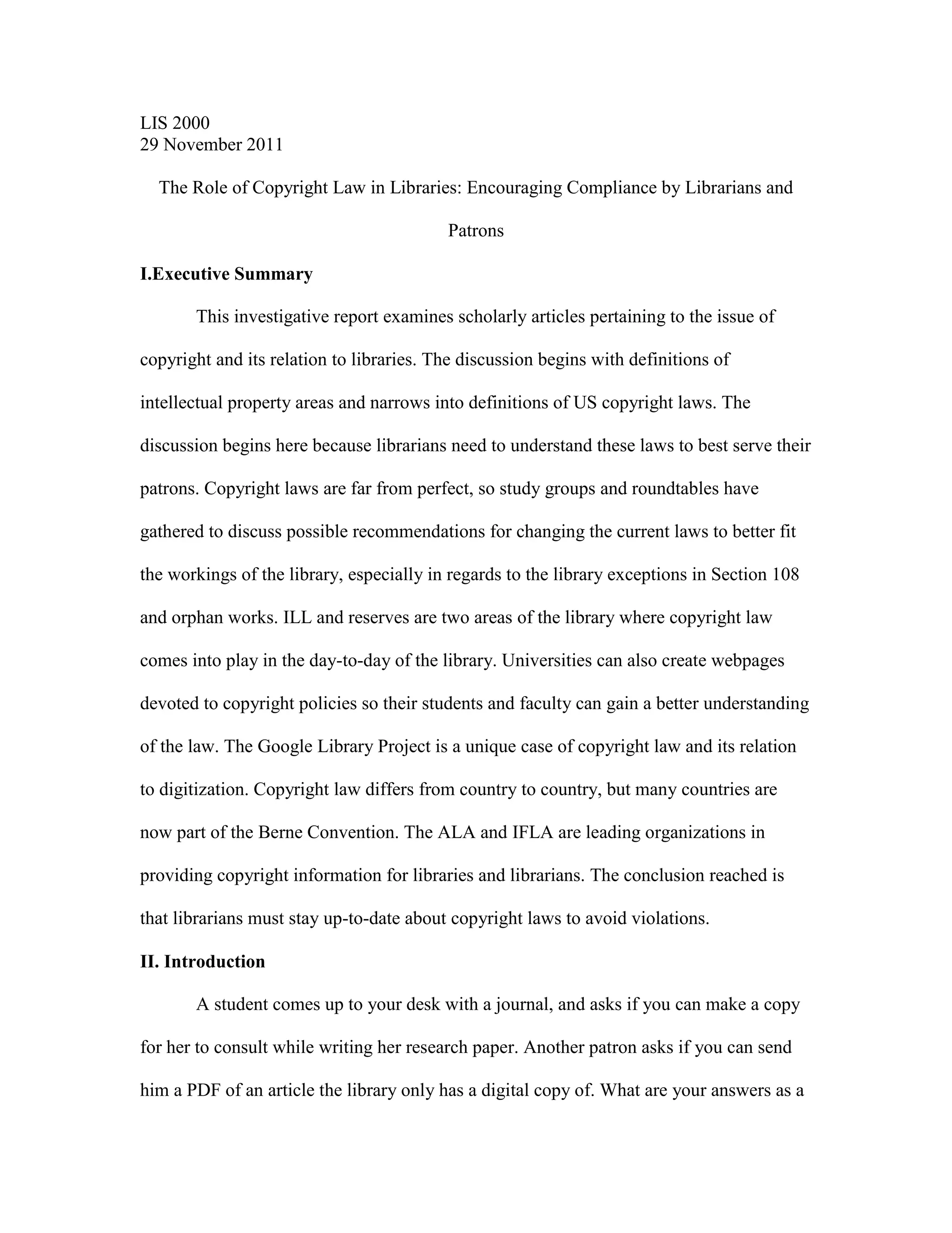 This document summarizes key aspects of copyright law as it relates to libraries. It defines intellectual property and the four types: patents, trademarks, trade secrets, and copyright. It examines US copyright law, including the Copyright Acts of 1790, 1909, and 1976. It discusses relevant sections for libraries, such as fair use (Section 107) and library exceptions (Section 108). It also covers issues like orphan works, works whose copyright owners can't be identified, and the shrinking public domain due to copyright term extensions. The conclusion is that librarians must stay up-to-date on copyright laws to avoid violations when providing resources to patrons.