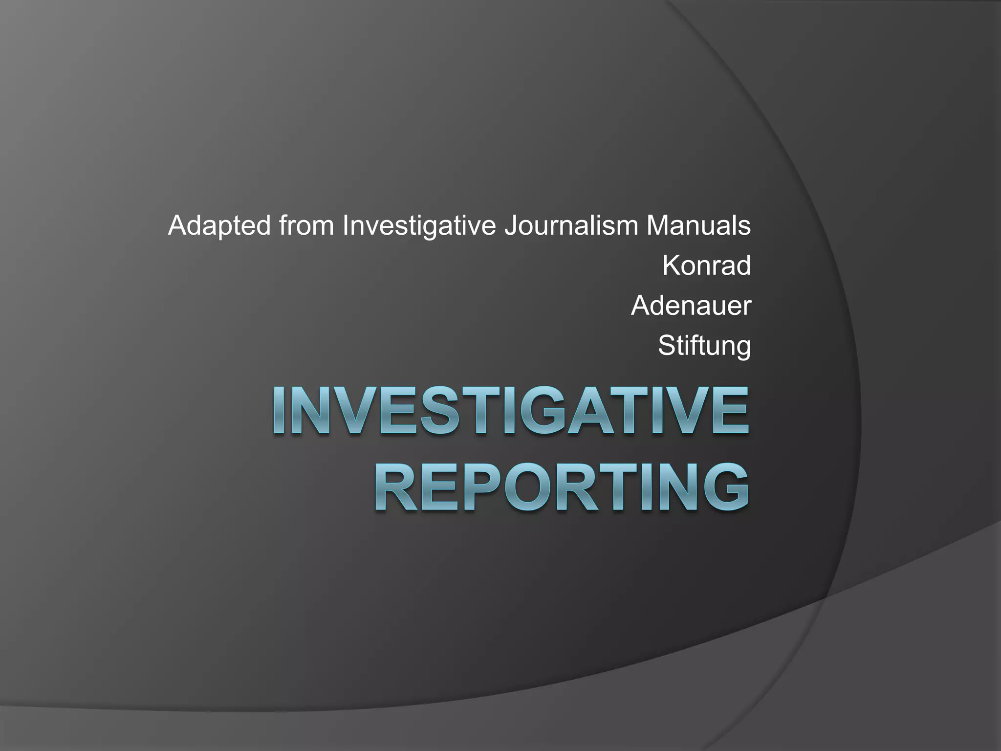 Investigative journalism involves deeply investigating topics of public interest, such as crime, corruption, or corporate wrongdoing. It requires original research through sources and documents to uncover new information or shed light on an issue in a way that reveals its significance. The core of investigative journalism is to uncover information that is in the public interest. Successful investigative journalists employ strong reporting skills, determination, and ethics to ferret out well-guarded information from hostile sources on issues that matter to readers.