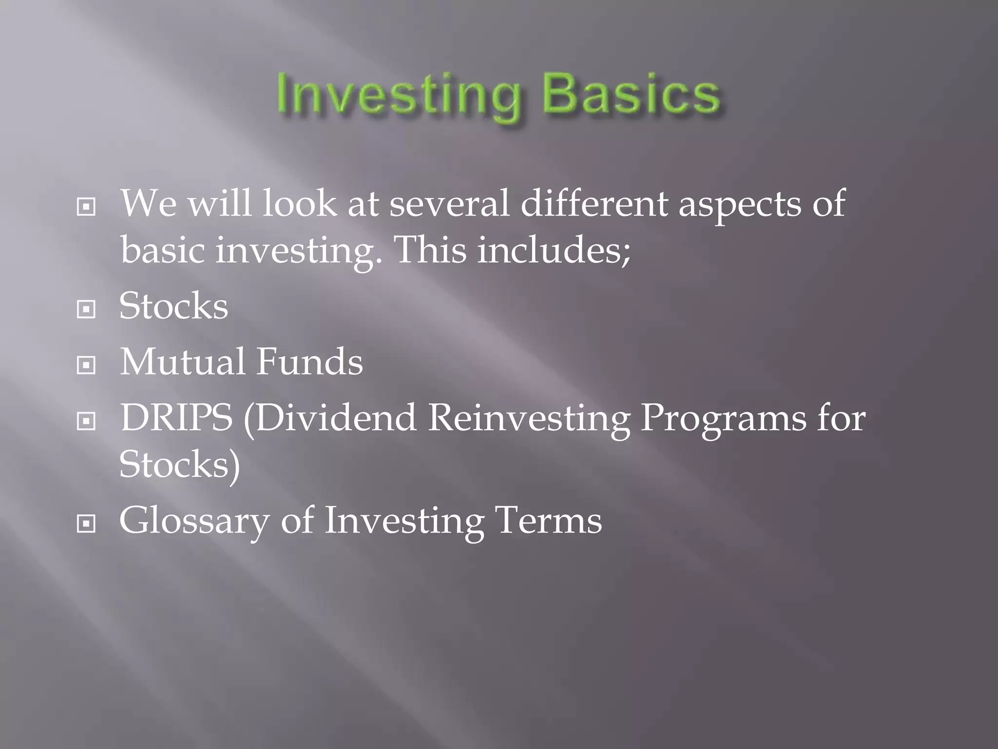 The document provides an overview of basic investing topics including stocks, mutual funds, DRIPs, and common investing terms. It defines what stocks are, how buying shares entitles the owner to potential price appreciation and dividend payouts. It also explains mutual funds and DRIPs as ways to invest without picking individual stocks. Finally, it includes definitions for several important investing terms.