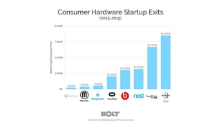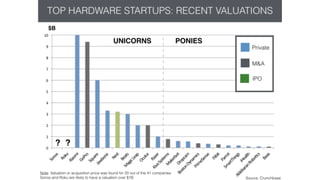 The document discusses trends in hardware startups and investing. It finds that investment in hardware startups rocketed between 2012-2013. While hardware makes up a small portion of total IoT spending, crowdfunding has become an important validation step for hardware companies to prove demand before pursuing larger VC rounds. Successful hardware startups often leverage software and recurring revenue business models, with crowdfunding helping to accelerate company value growth between funding rounds.