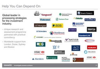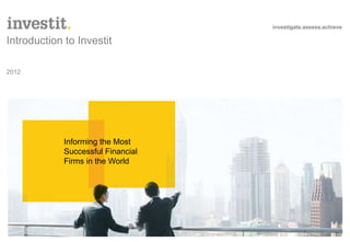 Investit is a global leader that provides investment processing strategies and consulting services to financial firms worldwide. It offers unique research and assessment programs partnered with practical consultancy. Investit has over 1,270 successful assignments with top financial institutions, delivering operational and technology excellence. It uses a proven three-step program to inform strategic decisions and deliver rapid results in cost reductions, service enhancements, and quality improvements. Clients praise Investit's specialist domain knowledge, practical approach, and ability to provide actionable insights and recommendations.