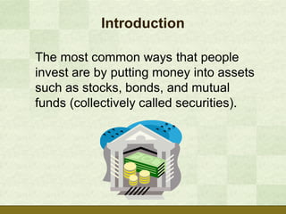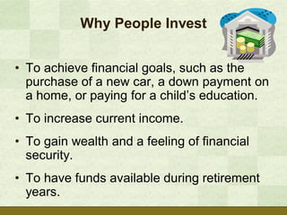 The document discusses various ways that people invest, including putting money into stocks, bonds, and mutual funds. It outlines reasons for investing such as financial goals, income, wealth, and retirement. Key aspects of investing covered include having a budget and savings plan, establishing investment goals, understanding returns, risks, and diversification. The document provides strategies for long-term investing like asset allocation, dollar cost averaging, and following golden rules of fundamentals.