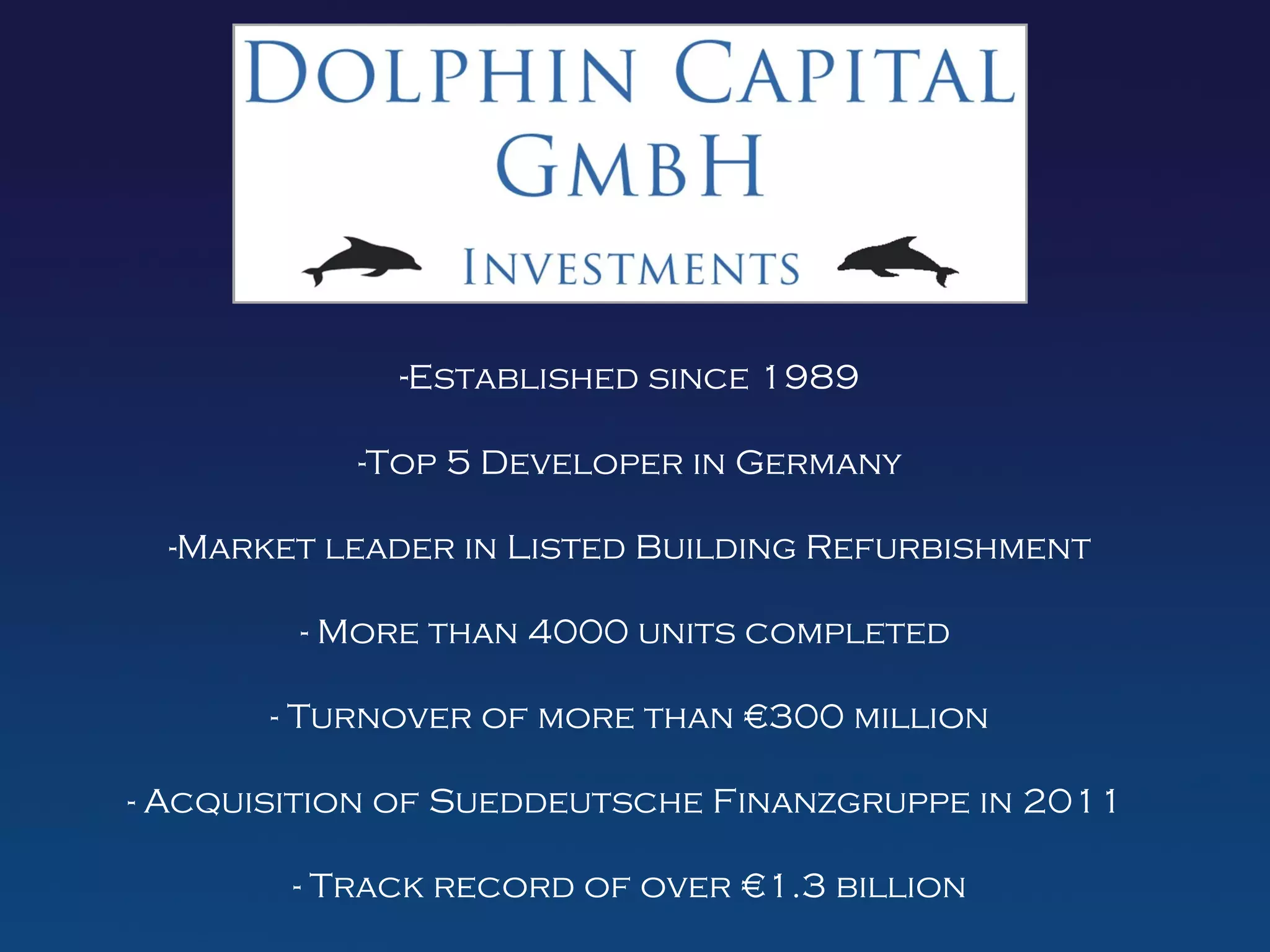The document summarizes information about a German real estate developer that specializes in refurbishing listed buildings. It has been operating since 1989, is among the top 5 developers in Germany, and has completed over 4,000 units with a turnover of more than €300 million. In 2011 it acquired Sueddeutsche Finanzgruppe and has a track record of over €1.3 billion in listed buildings. Only 1% of buildings in Germany have listed status, which receive tax incentives for purchase and preservation. The developer uses special purpose vehicles and sales agencies to conduct off-plan sales and separate operations for each project. It typically funds projects through banks, pension funds, private equity, institutions, and high-net-worth