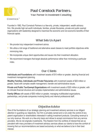 Paul Comstock Partners is an independent wealth advisory firm focused on providing objective financial and investment management services to high net worth individuals and families. The firm emphasizes the importance of a family-centric approach, addressing complex issues related to wealth management, governance, and financial planning through a collaborative advisory structure. Their services include cash flow management, estate planning, investment strategy development, and leadership training for family members to ensure sustainable wealth transfer and responsible stewardship.