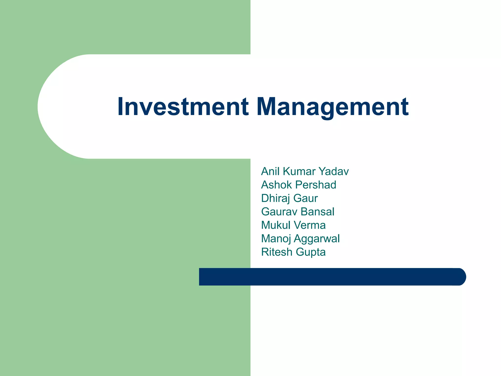 - The document describes an investment portfolio consisting of Bharti Airtel, Infosys, L&T, Reliance, and State Bank of India, making up 20%, 20%, 30%, 15%, and 15% of the portfolio respectively.