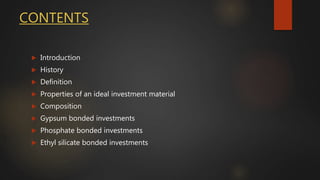 The document discusses investment materials used in dental prosthodontics, focusing on their composition, properties, and classifications such as gypsum, phosphate, and ethyl silicate bonded investments. It outlines the historical context and the requirements for ideal investment materials, including their thermal and hygroscopic expansions. The document also details the mixing and manipulation processes involved in preparing investment materials for dental applications.