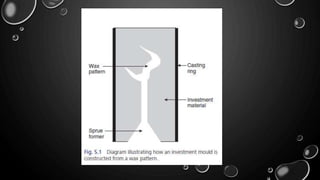 This document provides information on investment materials used for casting dental restorations and appliances. It discusses the requirements, composition, types based on binder, and expansions of different investment materials including gypsum-bonded, phosphate-bonded, and silica-bonded investments. Key points covered include the refractory and binder components of investments, setting and thermal reactions, and how their properties compensate for casting shrinkage. References are provided for further reading on dental materials.