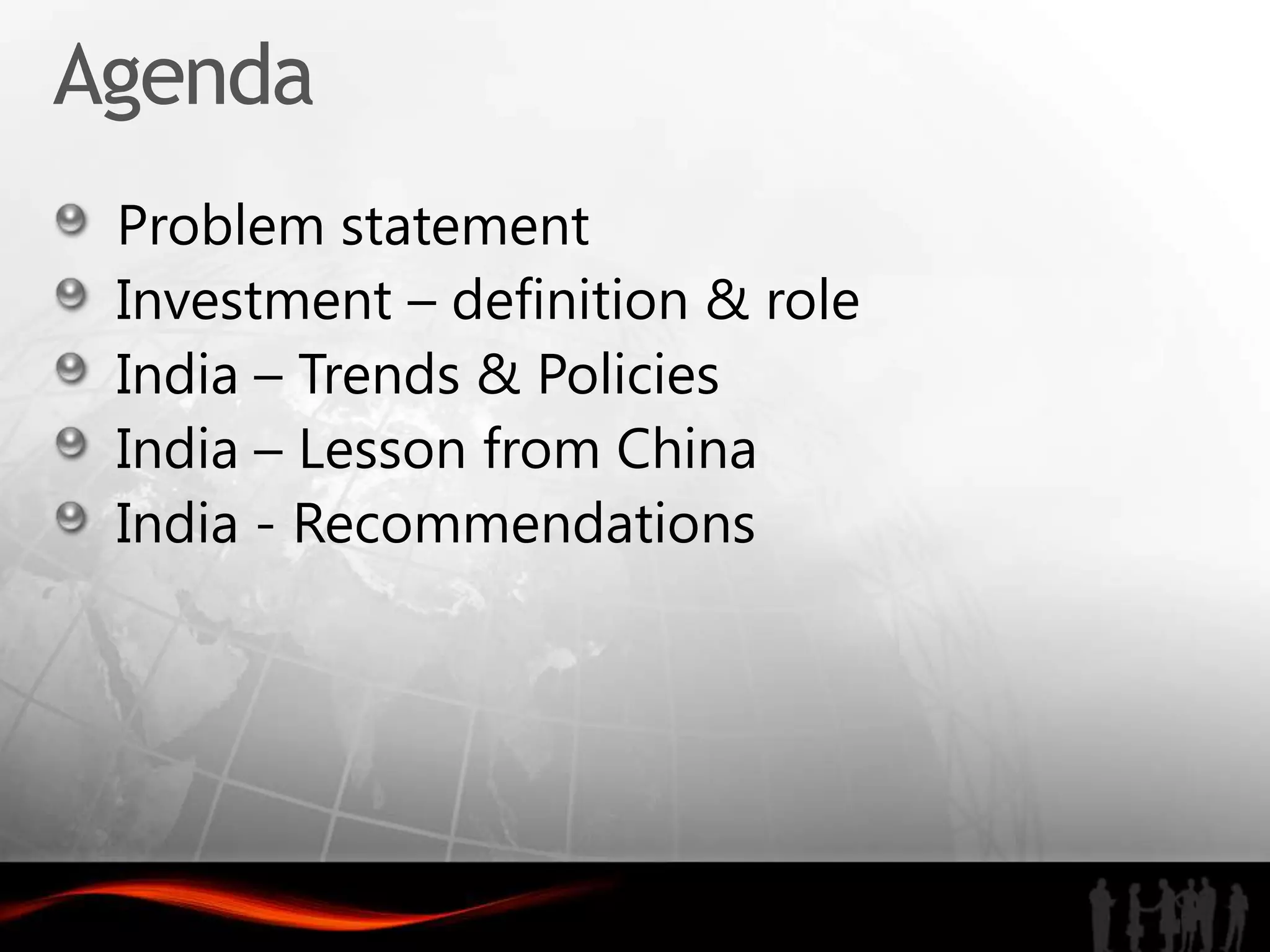 The document analyzes investment trends and policies in India. It finds that while domestic investment is rising due to government stimulus measures, public and private savings are not high enough. Foreign direct investment has grown steadily since the 1990s reforms, reaching $30 billion in 2009-2010, though India still lags China in FDI and infrastructure development. The document recommends improving infrastructure, developing skilled labor, enhancing special economic zones, strengthening intellectual property rights protection, and better coordinating central and state investment policies to attract more high-quality foreign investment to India.