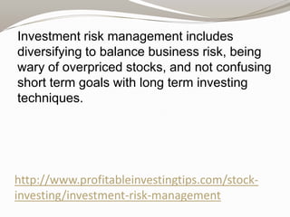 Investment risk management involves diversifying investments across different market sectors to reduce risk, avoiding overpaying for overpriced stocks, and having clear investment goals aligned with either long-term or short-term strategies. Key aspects of risk management include conducting fundamental analysis of stocks to evaluate pricing and financial ratios, diversifying across different industries that may be impacted differently by economic conditions, and maintaining a long-term perspective when investing rather than being swayed by short-term market volatility. The document provides tips on how to approach investment risk management through diversification, fundamental analysis, aligning with investment time horizons, and avoiding making decisions based on shifting economic sentiment.