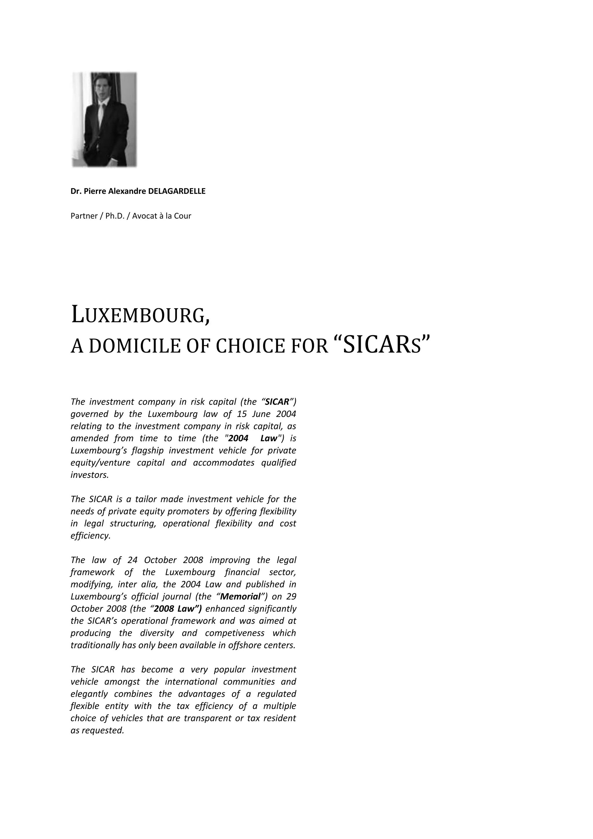 The document comprehensively outlines the legal framework and operational details of the investment company in risk capital (SICAR) under Luxembourg law, emphasizing its advantages as a flexible and tax-efficient vehicle for private equity and venture capital. It describes eligibility criteria for investors, types of assets and investment strategies allowed, and highlights regulatory compliance requirements overseen by the Commission de Surveillance du Secteur Financier (CSSF). Additionally, it addresses capital structure, taxation implications, and the roles of required service providers in the management of a SICAR.