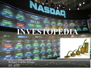 Investopedia is a stock market simulator that allows users to track virtual portfolios and learn about investing. The author enjoys using Investopedia to understand how the stock market works with different stocks listed on the major exchanges like NASDAQ, NYSE, and AMEX. As a beginner investor, the author has experienced both profits and losses through practicing strategies on Investopedia. It is a good learning tool for understanding concepts like buying power, cash levels, and annual returns without the real risk of losing money in the live markets.